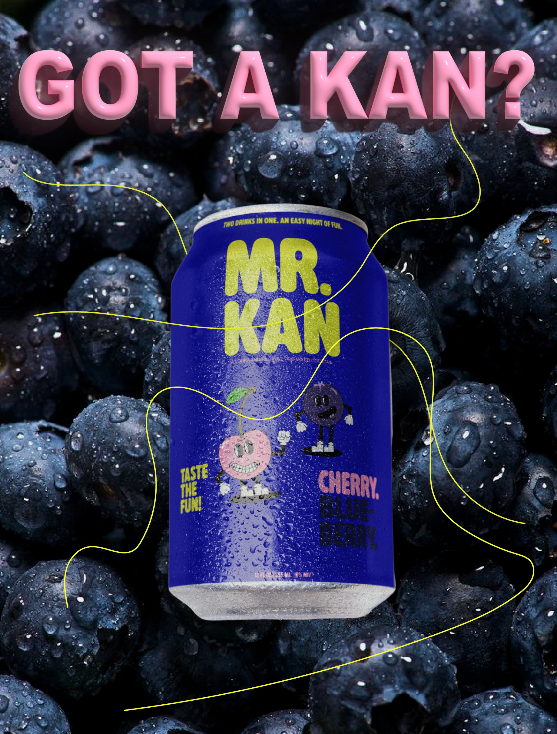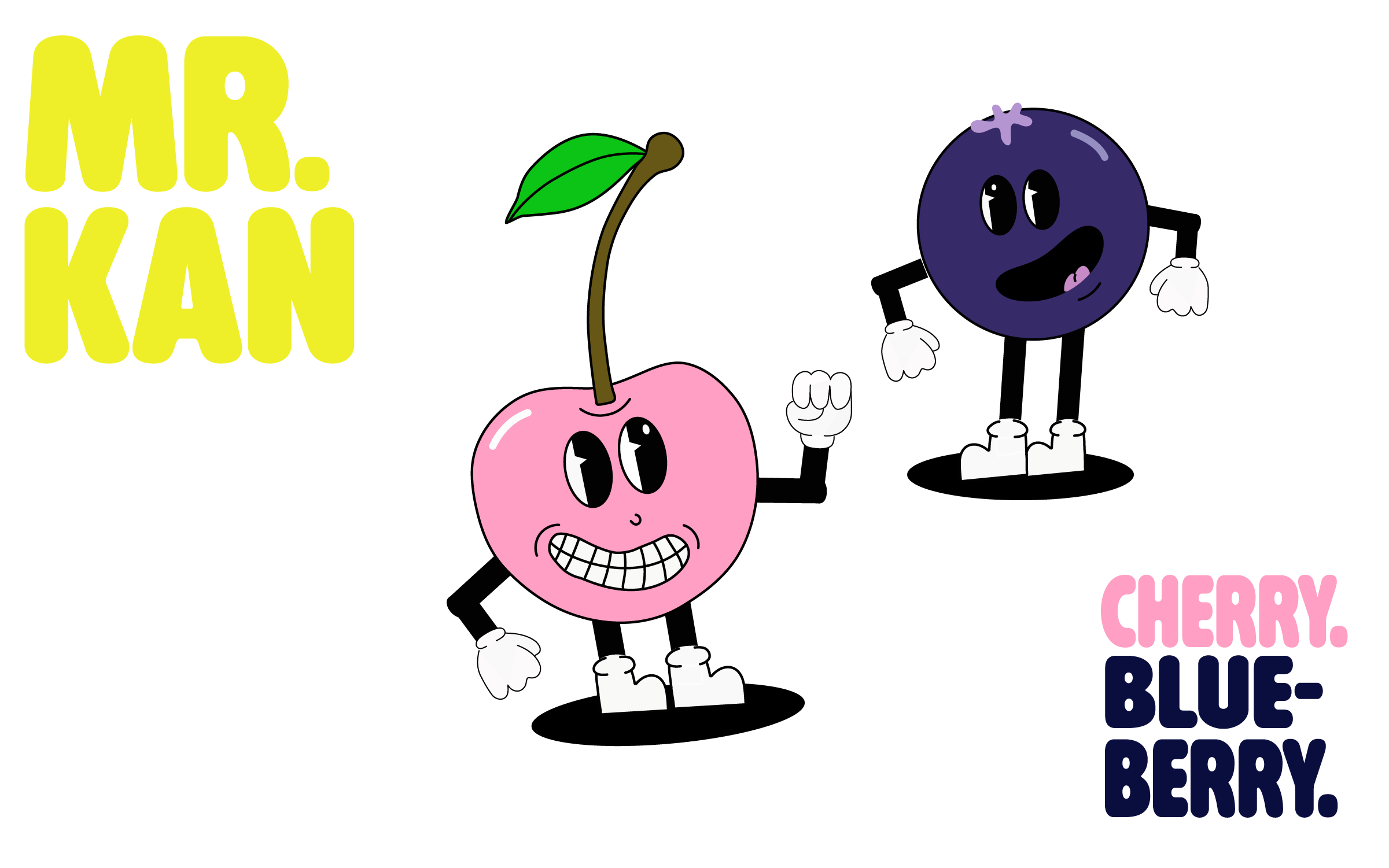 To portray a motif for the flavor, I decided to create two characters for the brand Mr. Kan. Because the name of the brand involves the name of someone, or something, I wanted to add characters into the brand to enhance that element. I created a cherry and blueberry character to act as playful characters in the story of Mr. Kan. Similar to the character of Pringles, the cherry and blueberry characters act as a friendly mascot that consumers might connect with when looking for a drink to try or reach for repeatedly.